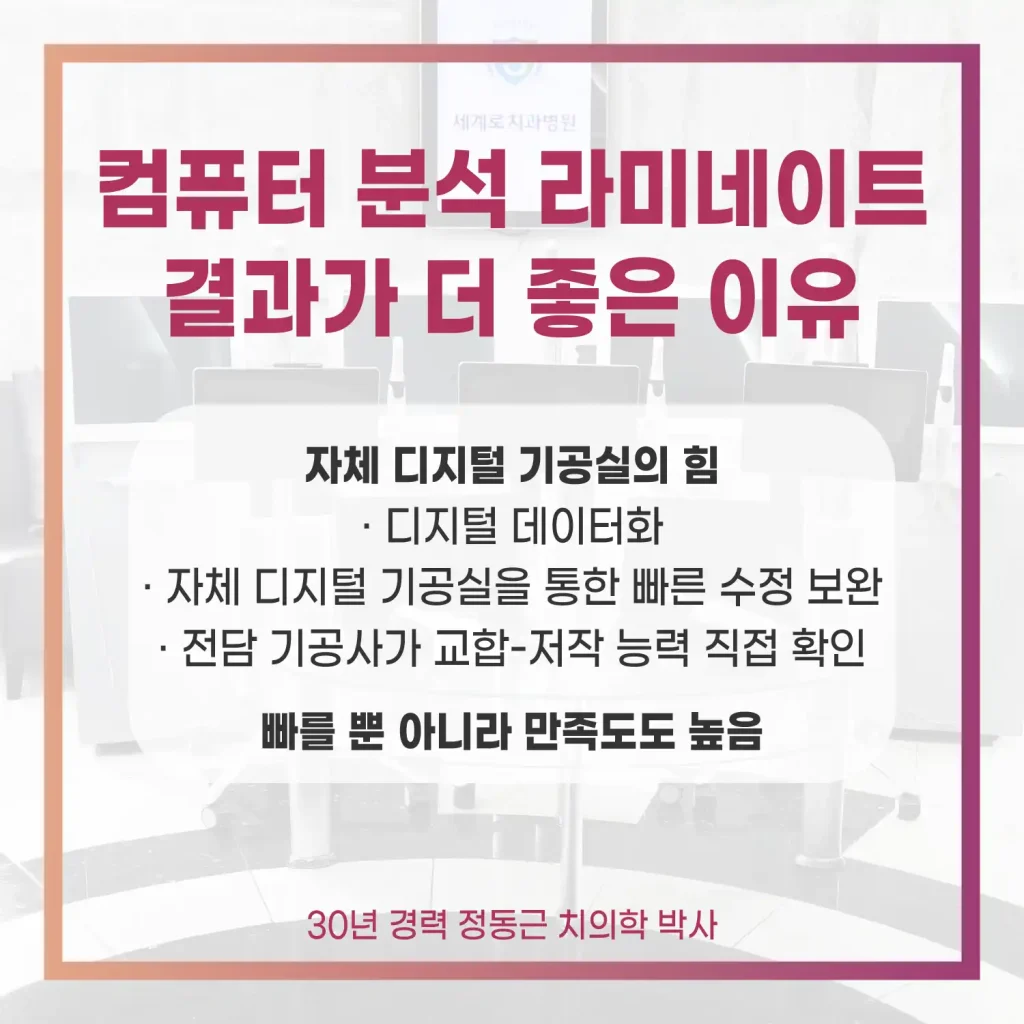 디지털 컴퓨터 분석 라미네이트의 경우, 자체 기공실 여부에 따라 내원 횟수가 2~3회 정도로 단축될 수 있습니다.